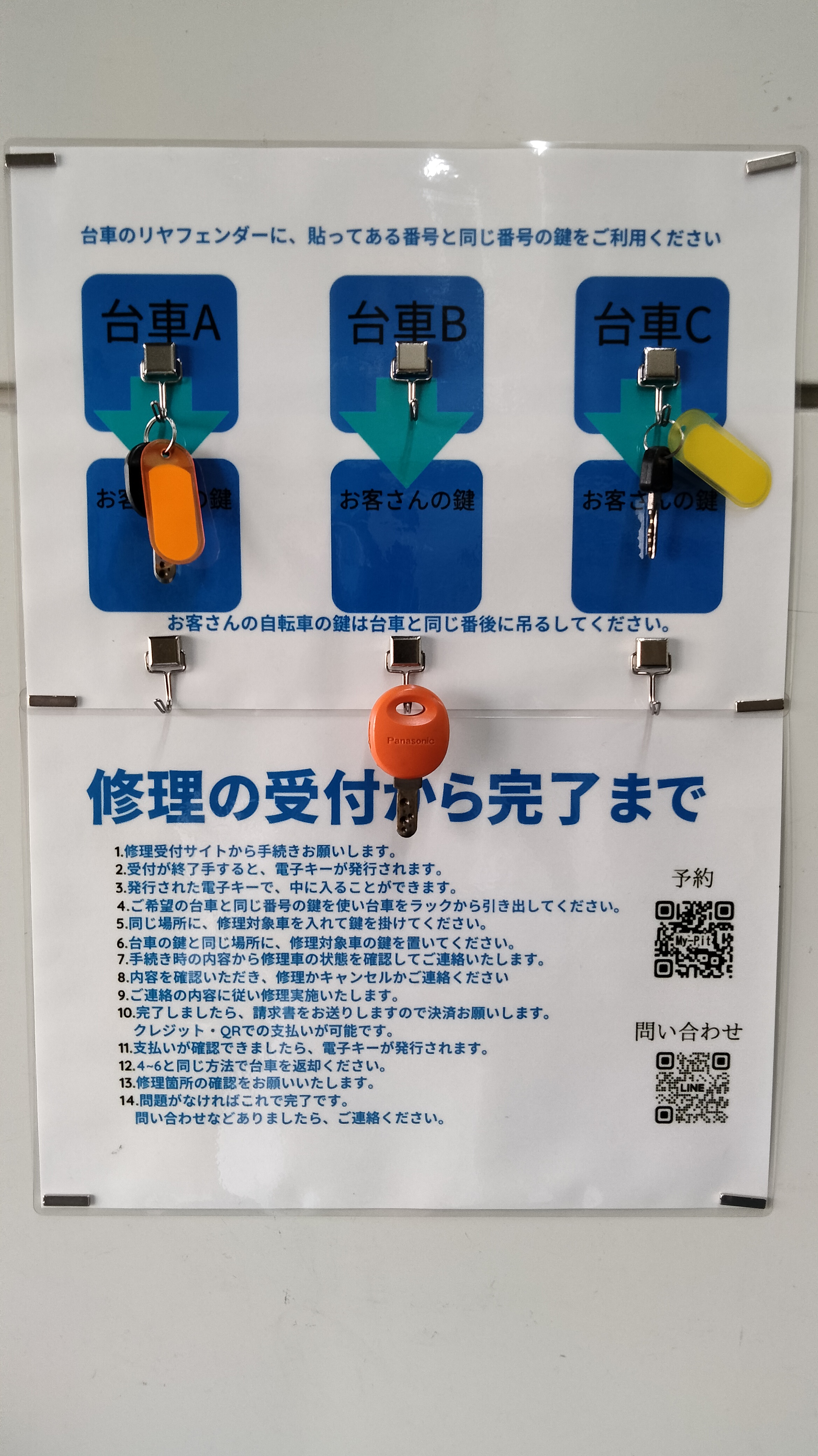 6)修理車の鍵を下のフックにぶら下げて手続き完了です。